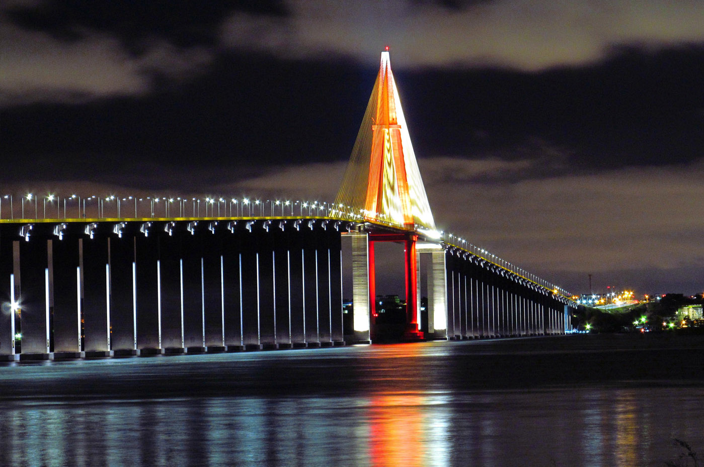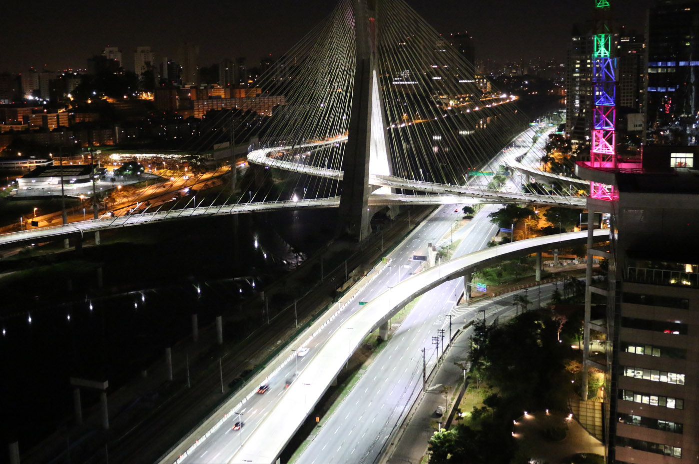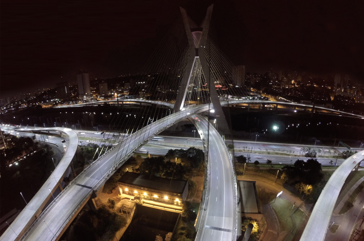 A ponte Octávio Frias de Oliveira, localizada em São Paulo, é formada por duas pistas estaiadas em curvas independentes de 60º que cruzam o rio Pinheiros.